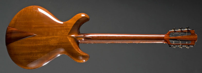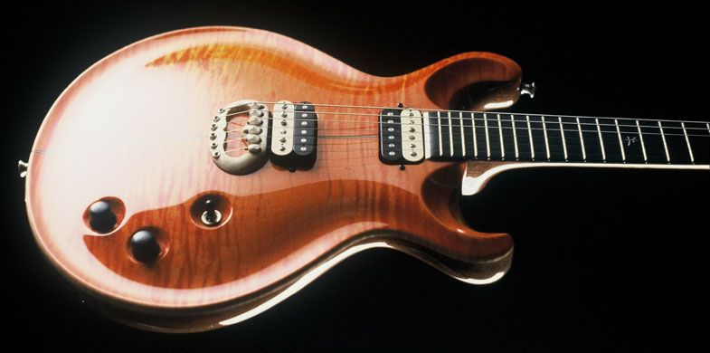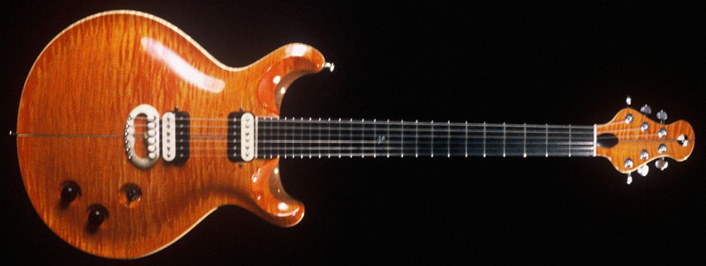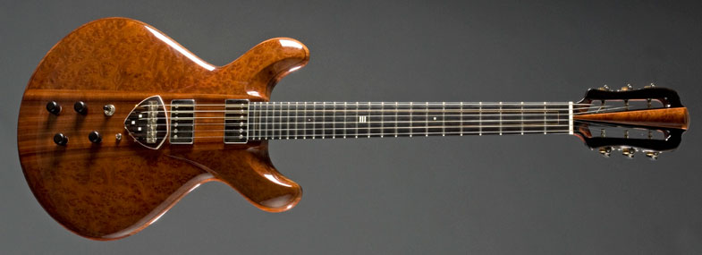 • Goldorak. Cette guitare est creuse mais sans port acoustique (défonces). Le pont est encore maison. Matériaux Padauk, camphrier, ébène, ivoire et carbone.