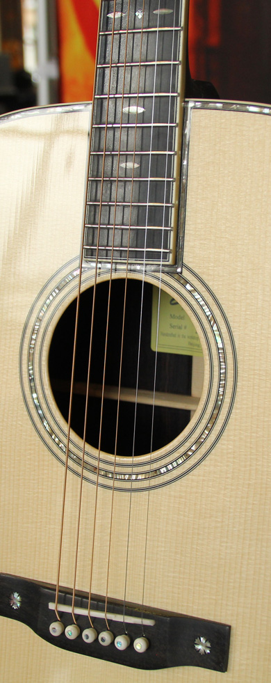 C'est exactement le cas avec ce modèle E40D, qui se rapprocherait plus du style 45 de la célèbre D-45 que la D-40 avec sa nacre en bord de touche et de table. La qualité des essences est un point fort avec une table en Adirondack AAA et un palissandre indien pour le dos et les éclisses. Le son est au rendez-vous. Equilibre, projection, caractère, tout ce que l'on demande à une dreadnought est là, bien présent sur ce modèle au prix presque indécent tellement il est bas pour ce type d'instrument.