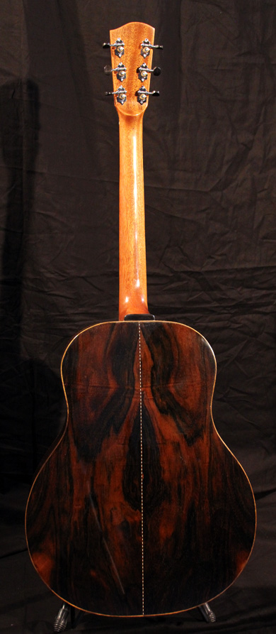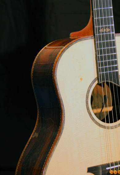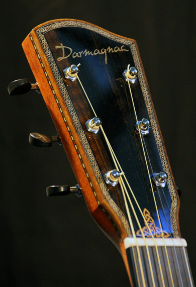 Eric Darmagnac fait partie de ces nouveaux "princes" de la guitare folk avec une très forte personnalité, tant dans le design et la marqueterie que dans le son de ses guitares. Le modèle Braz.D.1446 avec une table en sitka et un dos et des éclisses en Rio est une pure beauté.