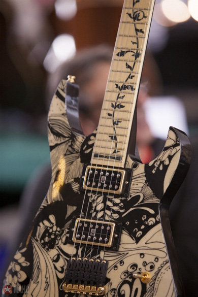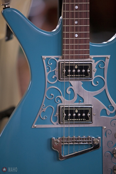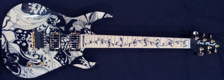 Cette année pour le salon de la belle guitare de Guitares au Beffroi, Eric nous a présenté, en plus des 3 modèles qu'il a exposé pour Graines de Guitare, sa toute dernière création "Lë-Hoa" réalisée sur mesure pour le guitariste Yannick Dumont que vous retrouvez ci-dessous en vidéo, une électrique joliment vêtue et dotée de deux micros Benedetti (Rock et Matrix)).
