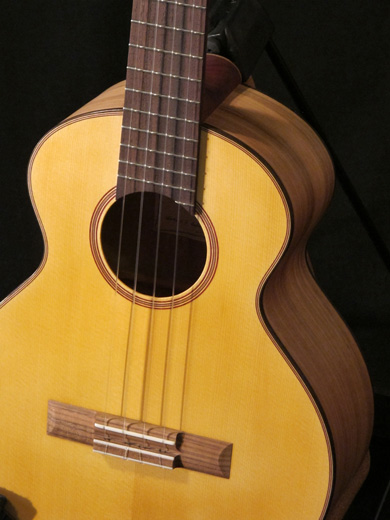 L'un est en épicéa pour la table (les photos de gauche) et l'autre en cèdre (photos de droite). On remarque de suite l'originalité du corps, dessiné par Fabien, avec des formes bien rondes et une caisse bien profonde. Cela a séduit immédiatement Aël et Adrien. Mais c'est bien évidemment le son qui a provoqué chez nos amis ukuléistes le plus grand émoi.