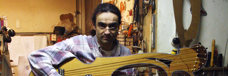 Je suis luthier depuis 1995 et tiens un magasin depuis 1997. Depuis 2003,je me suis spécialisé dans les guitares Multicordes et les harpes guitares. Mes influences sont très variées et forment un melting-pot à ma sauce avec l’école viennoise des kontragitarres, les manches flottants, les barres de décharges dans les corps, les doubles dos flottants comme Reisinger, Raab, Stauffer, Scherzer et des amis luthier qui m’ont encouragé et conseillé comme Fred Carlson, Jeffrey Elliot et Mike Doolin. Presque toutes mes créations sont des commandes sur mesures pour des musiciens du monde entier cherchant à étendre leur registre ou mélanger plusieurs instruments.