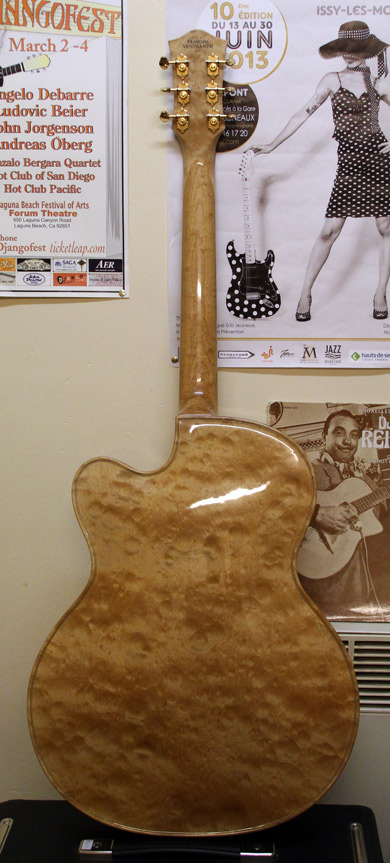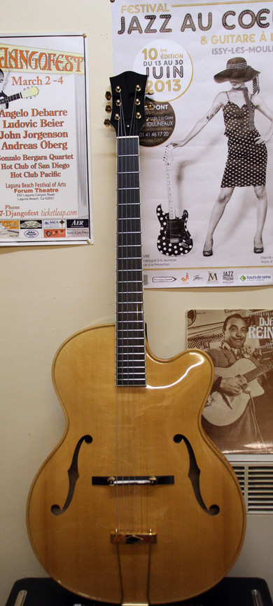 J'ai été bluffé par la puissance et le rebond acoustique de cette archtop dont le sustain est excellent ! Cette guitare qui a d'ailleurs trouvé un heureux propiriétaire le jour même de la présentation à Guitare Village.