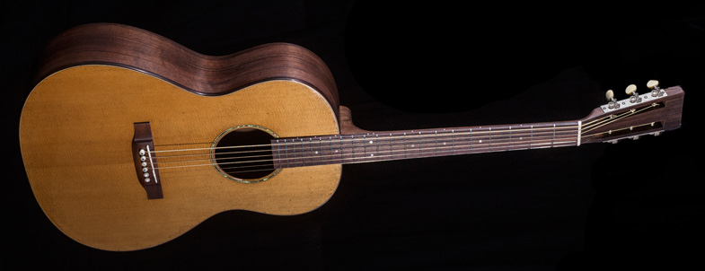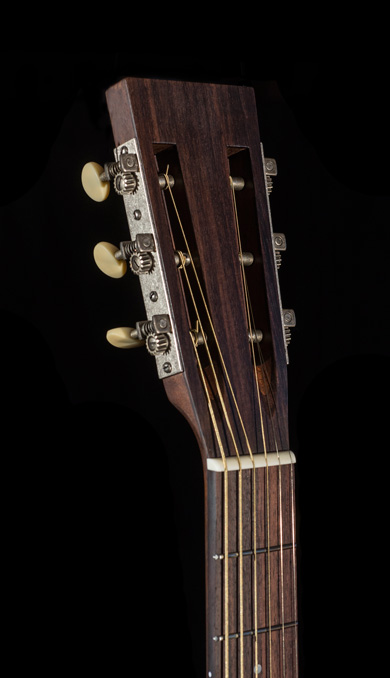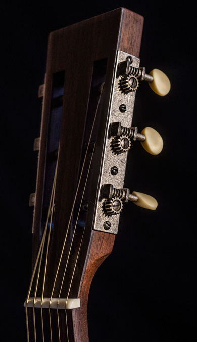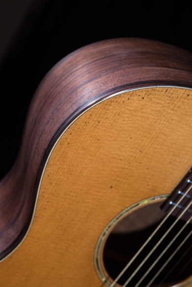 Inspiré d'un format 00 dont les courbes ont été redessinées, c'est l'élégance et la sobriété qui séduisent le regard. L'impression "patine" que le luthier a souhaité sur ce modèle est tout à fait réussi et l'aspect Vintage en fera craquer plus d'un ! La table d'harmonie a été artificiellement vieillie. Tout d'abord, le luthier a reproduit des coups en marquant certains endroits de la table avec une rose des sables. Celle-ci est ensuite légèrement teintée et un vernis polyuréthane y est appliqué. Seule la table est vernis sur ce modèle. Caisse et manche sont huilés et cirés, ce qui donne cet aspect patine souhaité par François.