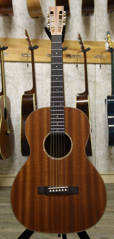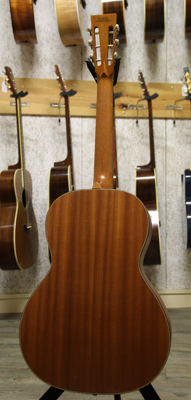 La 4 ème et dernière folk Vendramini que je vous présente, est une parlor tout en Acajou Sapelli. C'est chez Martin en 1940 que la production de modèle avec table, dos et éclisses en acajou vit le jour (style 15 et 17). L'acajou à l'époque était le bois le moins cher mais il s'est avéré être une essence très intéressante pour les manches également.