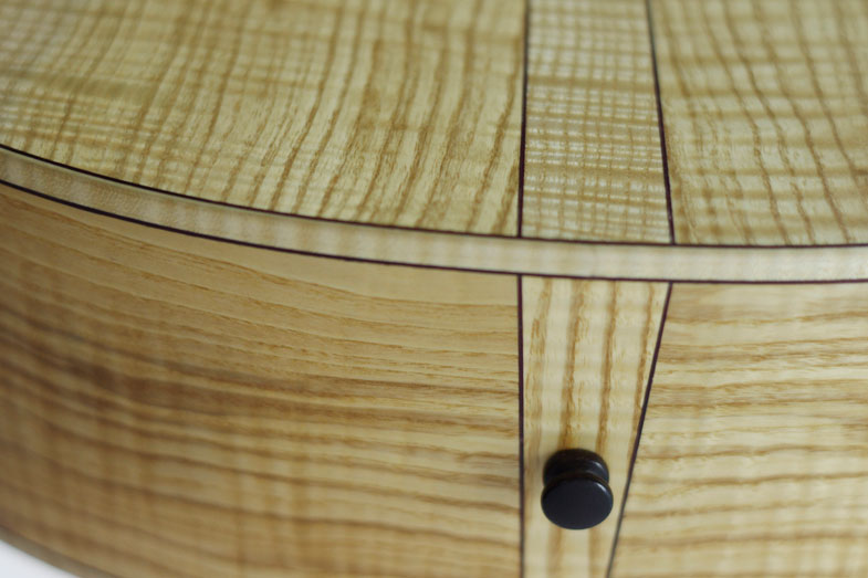 Cette version « Fraxinus » est construite en bois régionaux comme toutes celles de la série Ouessant , frêne ondé des Ardennes pour le coffre, cèdre pour la table, cormier pour les pièces de structure, bindings en érable ondé.