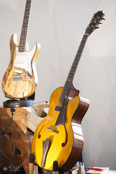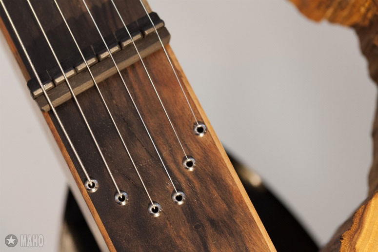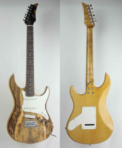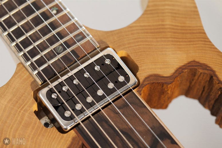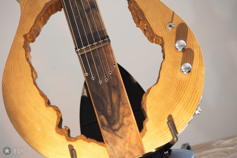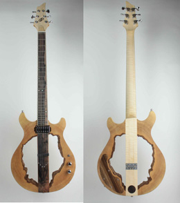 | L'inspiration est un sentiment que l'on ne prévoit pas. Cette guitare, issue d'un frêne creux en bois de bout, ne ressemble à aucune autre. Pourtant, le son et l'ergonomie en font un instrument d'une grande jouabilité. Son micro magnétique avec push pull, doublé d'un piezo permet une grande variété de sons, autant que sa poutre centrale avec cordes traversantes qui assure une rigidité à toute épreuve. |