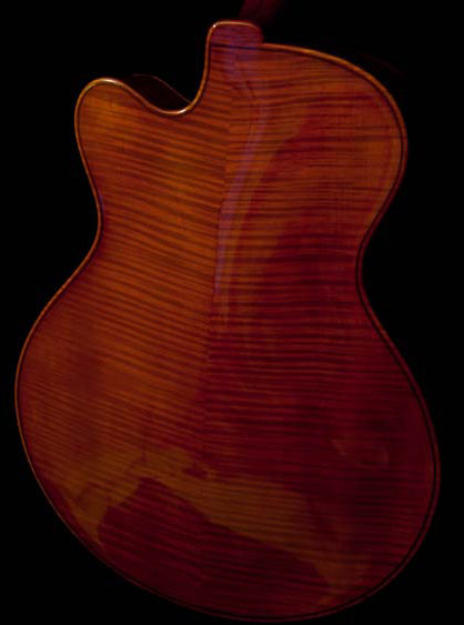 Nous retrouvons un épicéa pour la table avec deux ouïe en "f" et un magnifique érable ondé pour le dos et le manche, l'érable étant le bois de prédilection pour ce type d'instruments dédiés au jazz.