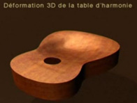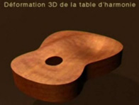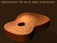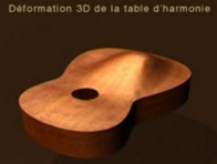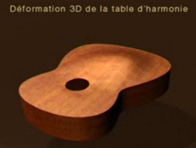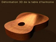 | Ci-dessous, le comportement de la table (mouvements amplifiés d'un facteur 1500) induit par le chevalet, lui même induit par le mouvement des cordes. La vidéo complète de la "modélisation d'une guitare acoustique" est disponible sur le site Interstices. |