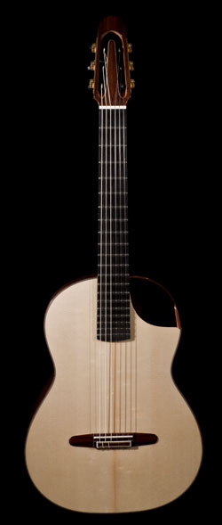 Le modèle présenté est un modèle de concert Alysce composite avec une table peau épicéa, nomex et peau cèdre, un dos et des éclisses en palissandre indien, un manche en acajou, chevalet palissandre et touche en ébène.