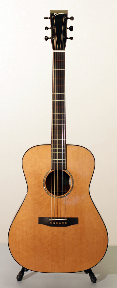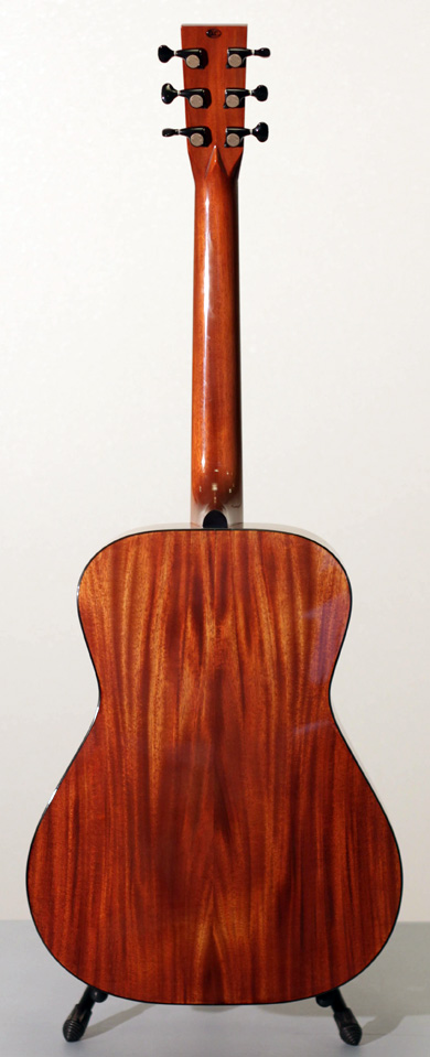 Parmi les deux modèles que je vous présente pour cette 25 ème édition du salon de lutherie d'Issoudun, voici le modèle acajou/sitka avec un diapason de 64,6 cm. L'autre modèle, palissandre/cèdre est réalisé avec un diapaon inférieur de