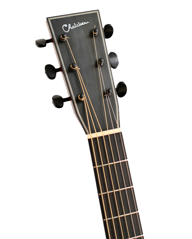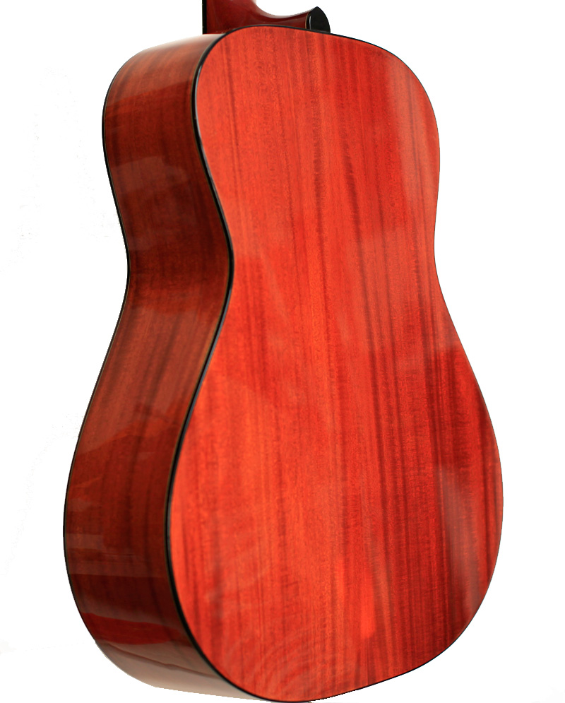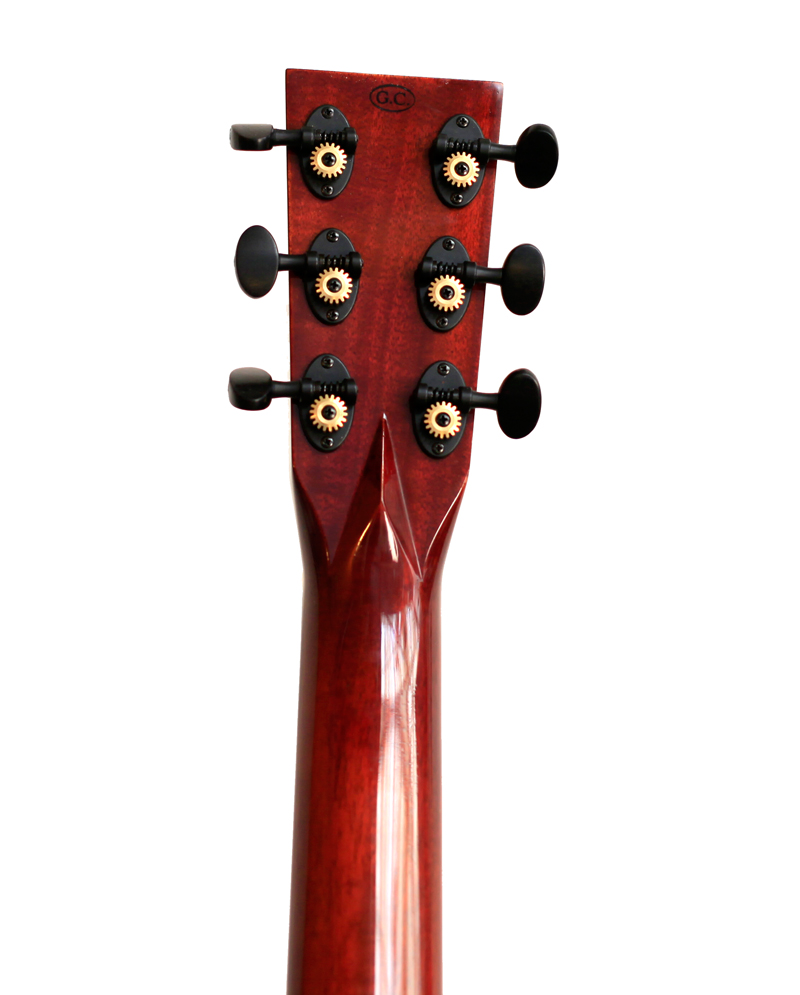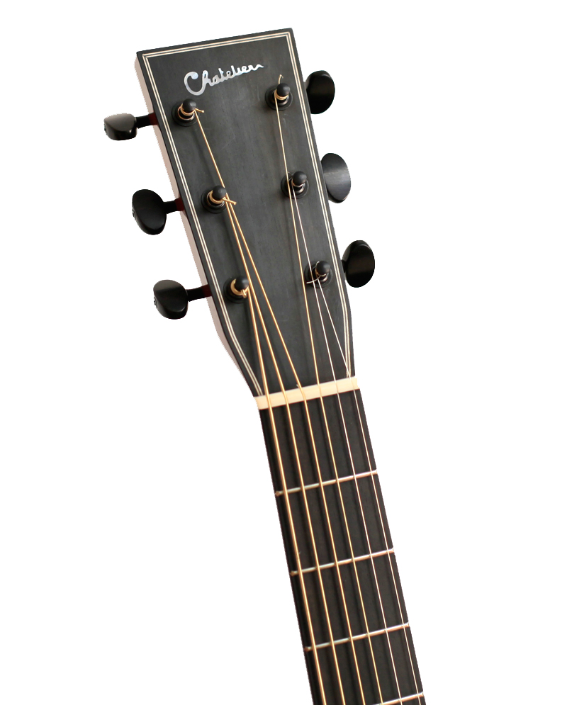 Pour le dos, les éclisses et le manche, nous avons ici un bel acajou teinté mis en valeur sur la caisse par un binding noir et une fileterie très sobre composée d'un très léger purfling en érable et ébène. Cette décoration épurée confère à l'instrument une très grande classe mise en valeur par le dessin très classique mais redoutable de la tête avec un plaquage en ébène de Madagscar qui laisse apparaitre le logo "Chatelier". Une plaque de protection reprenant les couleurs dominantes de la guitare est ici adaptée à la taille de l'instrument et respecte à merveille les lignes de l'instrument. Les mécaniques Schertler sont magnifiques et apportent une touche vintage au modèle. Elles sont précises à l'accordage.
