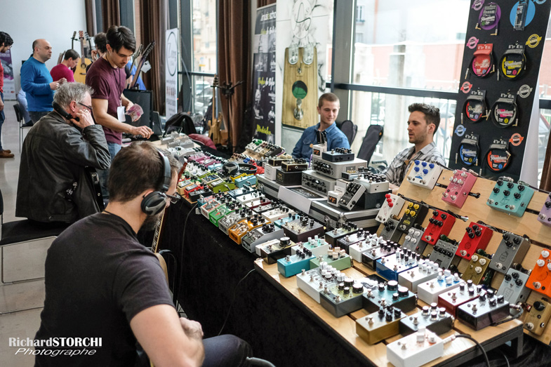 | De gauche à droite : le stand de'Iusic-School et Anasounds aux côtés de Filling Distribution et ses nombreuses pédales |