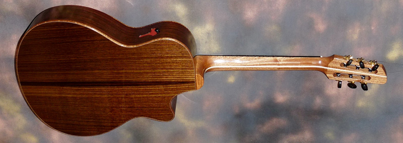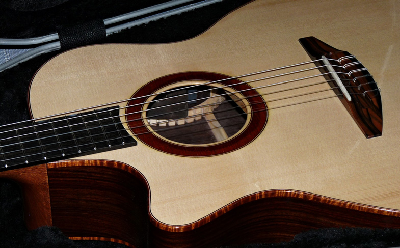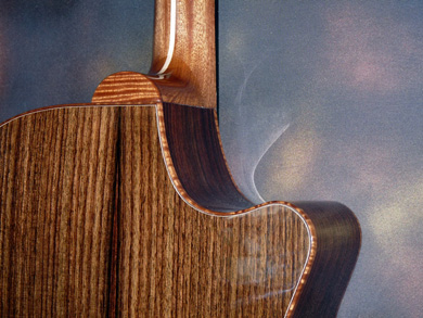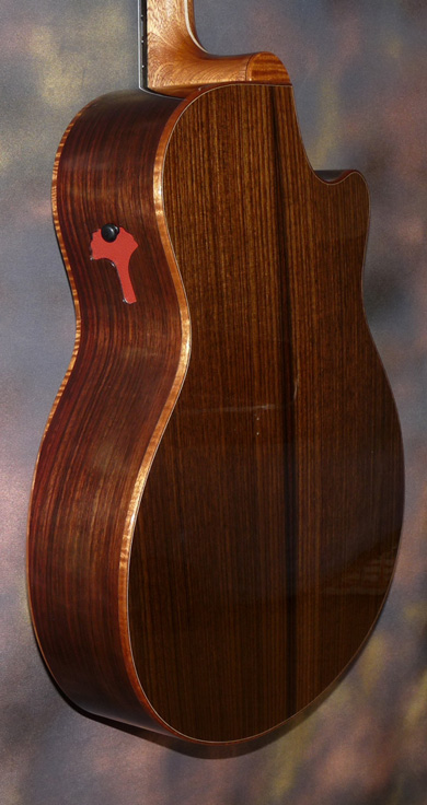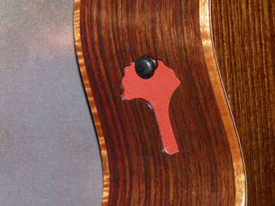 Très beau travail de finition sur l'ensemble de la guitare. Le choix du Macoré ondé pour les filets et le arm rest est magnifique. Il se marie à merveille avec le palissandre du dos et des éclisses.