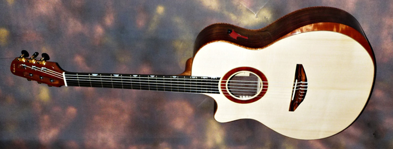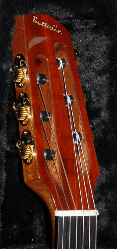 Voici un très beau modèle grand auditorium à cordes nylon qui a été commandé en version gaucher au luthier Guy Butterlin.