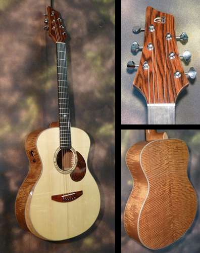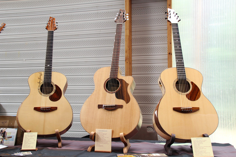 Le modèle joué pour la démonstration fait partie de la gamme "Partage" avec une table en épicéa européen et un dos et des éclisses en macoré. La guitare est dotée d'une belle personnalité sonore avec des médiums et des aiguës magnifiques. Les basses rondes et généreuses viennent agréablement s'imposer à l'oreille grâce à l'évent de petite taille muni d'une trappe afin d'en doser la projection. Le confort est ici optimum et c'est l'un des points forts des guitares de Guy. Ce modèle a été signé par Tommy Emmanuel pour saluer le travail du luthier et il le mérite amplement !