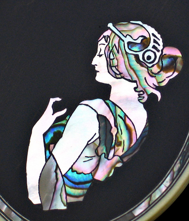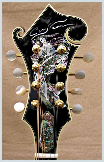 Pour cette mandoline, mon client souhaitait des motifs facon "Art nouveau", je me suis donc inspiré du célèbre peintre de la belle époque, Alfonse Mucha, pour réaliser la décoration de cet instrument.