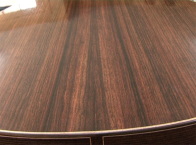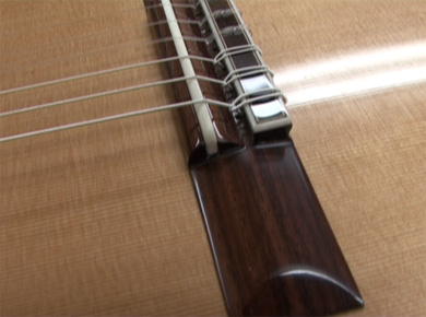 La particularité du travail de Bruno réside dans le travail de la table d'harmonie. Même si le barrage reste classique, en éventail et une barre transversale sousle chevalet, la grande originalité des tables de Bruno réside dans les 21 mesures différentes d'épaisseur de la table qui favorisent des zones particulières et qui donnent un caractère asymétrique au barrage d'où la grande puissance et l'égalité du son.