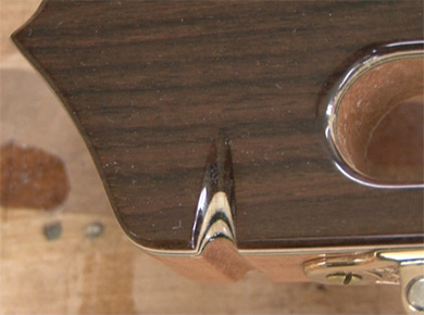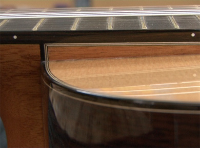 On remarquera aussi le travail effectué sur la touche qui est surélevée afin de faciliter l'accès aux aigus. En effet, sur une guitare grand concert, pas question d'avoir un pan coupé. C'est une question de principe et comme on le sait, il y en