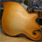 John : Je possède des copies des photos couleur et noir et blanc qui ont été prises à l’atelier de D’Angelico en juin 1957. On peut y voir le propriétaire de la première guitare Teardrop, Pete Girardi, ainsi que John D’Angelico qui s’affaire à fabriquer différentes parties de la guitare. On y voit John sculpter le dos en érable, montrer les côtés après les avoirs courbés, et envelopper de ruban le pourtour de la tête surdimensionnée, qui sert probablement à contrebalancer l’appendice de la partie inférieure droite du corps de la guitare. La guitare comporte des pièces de conception très intéressante, notamment le pont en escalier et la plaque anti-égratignures (pickguard) qui rappelle la forme unique de l’appendice de la guitare.