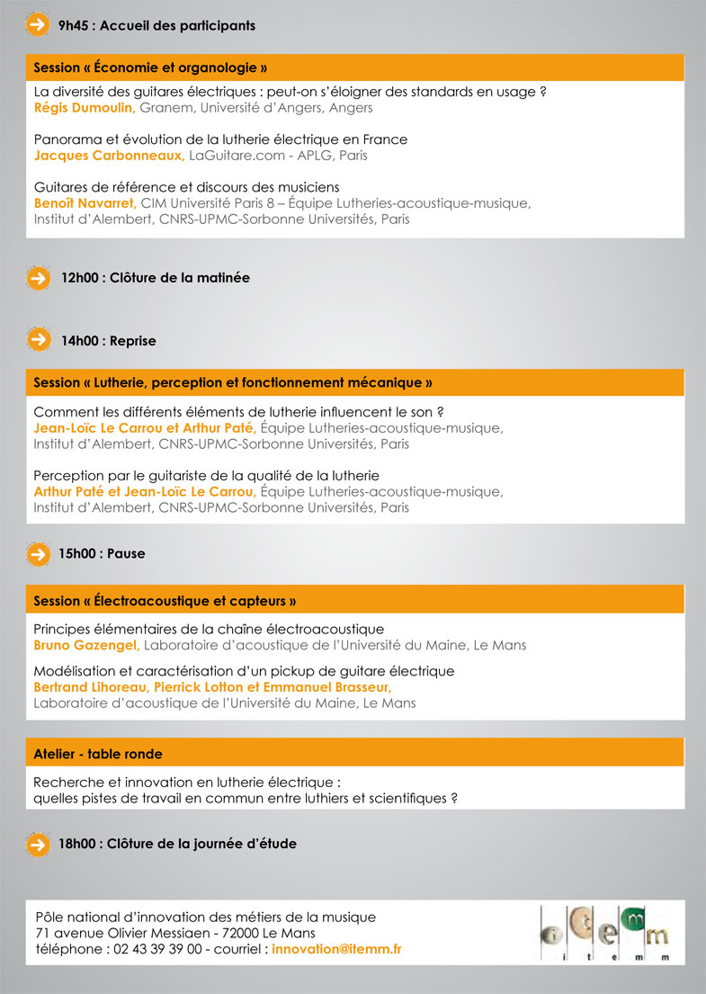 Cette journée est plus particulièrement destinée aux luthiers fabricants et réparateurs de guitares électriques mais elle ouverte également et gratuitement au public musicien, intermitent du spectacle,scientifique, salarié, bref toute personne intéressée par le sujet. Ci-dessous, le programme de la journée.