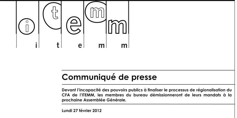 "Un conseil d'administration déterminant aura lieu le 9 mars. En cas d'échec, le Bureau du Conseil d'Administration démissionnera en bloc, et pourrait prononcer, faute de solution, la fermeture de l'Itemm. Cette annonce interviendrait dès l'assemblée générale du 4 mai 2012."