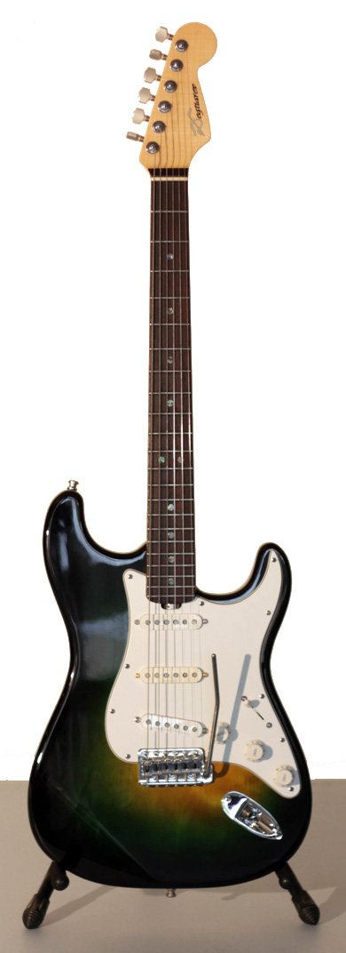 Le corps a été réalisé avec un Aulne de plus de 30 ans, séché comme il se doit. Le manche est en érable et cette guitare est équipée de deux Seymour Duncan et d'un Fender Custom Shop Fat' 50.