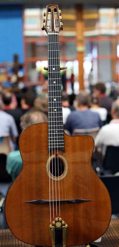"Cette guitare a une deuxième ouverture sur l'éclisse (côté graves ) ce qui permet au guitariste d'entendre avec plus de précision. L'instrument gagne aussi en volume sonore.
