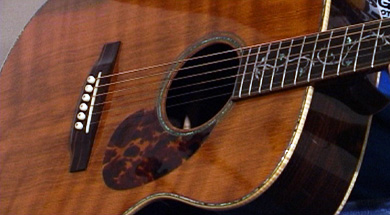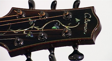 Vous remarquerez le magnifique travail d'incrustation réalisé sur la tête et sur la touche. Cette guitare est de toute beauté.