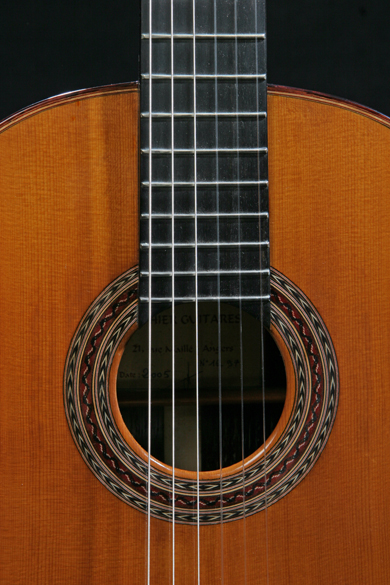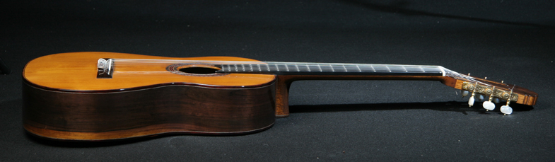 Les tables sont egalement toujours pliées juste derriere le chevalet et parfois "bronzée" aux UV pour leur aspect ambrée .Le manche en noyer est construit avec deux renforts d'ébène.