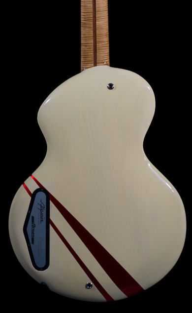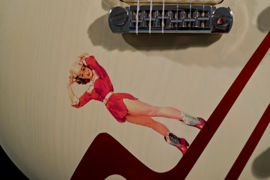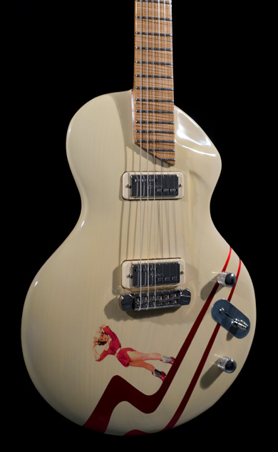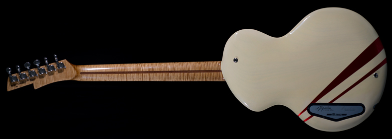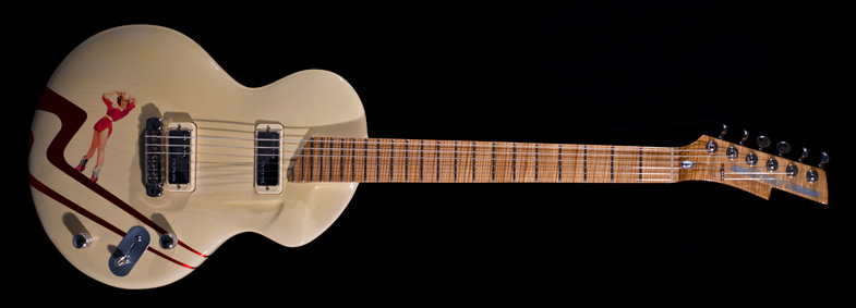 sur la forme de l'air-mail mais avec des spécifiités bien à elle. Jean-Yves aime l'histoire et comme le nom de cette guitare l'indique, il a voulu rendre hommage à l'euphorie de l'après-guerre qui a vu la créativité artistique de se débrider.