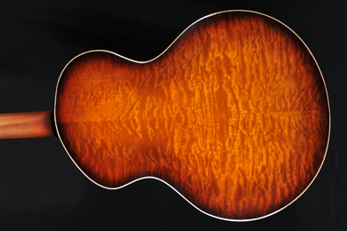 Un sunburst recouvre entièrement la guitare. Sur la table, le dos et même les éclisses et le manche. L'érable pommelé du dos et des éclisses est ici mis en valeur avec goût.