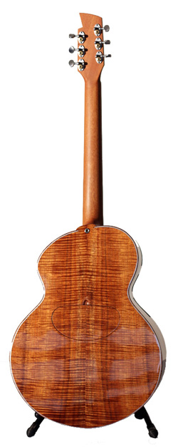 Le fond et les éclisses sont en Koa ondé massif de premier choix et le manche est en acajou.
