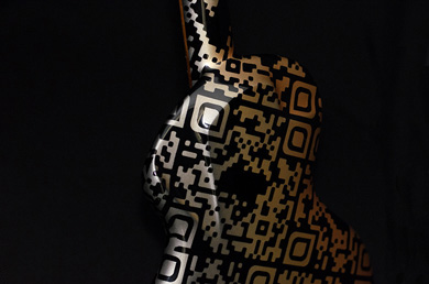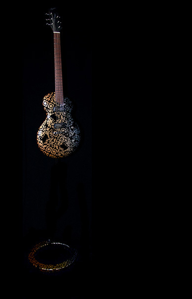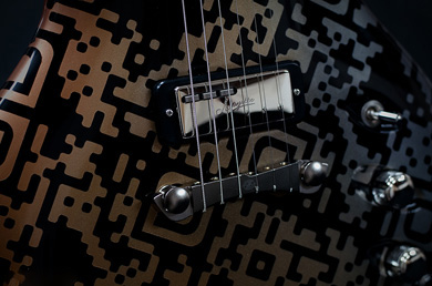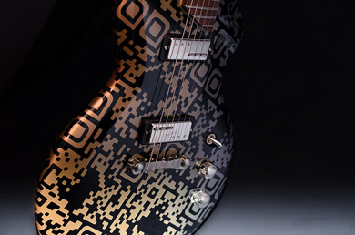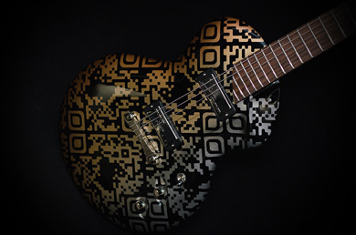 - Finition représentant le QR code , il suffit de flasher sur la guitare avec son smartphone pour aller directement sur le site internet de Jean-Yves Alquier. La signature électronique se trouve dans la finition et la finition est traitée comme un marquage de haute couture, or rose/or jaune/ platine, peint en dégradé sur le noir.