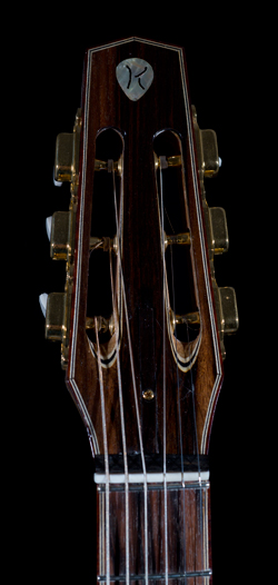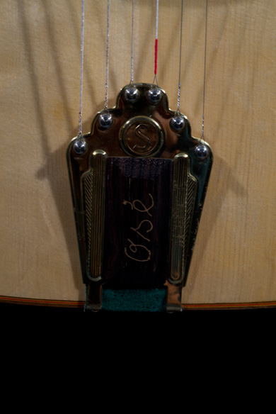 L'absence de la bouche sur la table ne suprend pas plus que ça, compte tenu du fait que tout le reste de la guitare resepcte les codes de la guitare mancouche avec son chevalet, son cordier