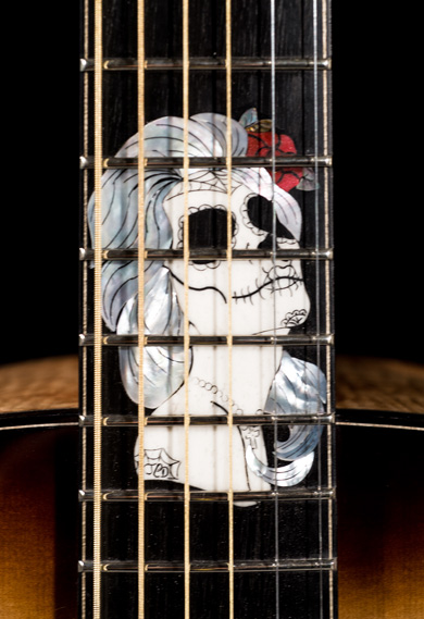 - Incrustation de touche : visage de femme maquillée Santa Muerte : os, nacre blanche, abalone, pearloid rouge avec des motifs gravés.