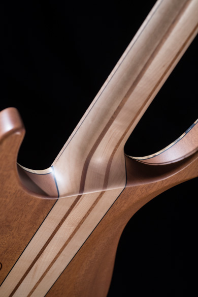 Le manche conducteur est en 5 pièces ( 3 d'érable et 2 d'acajou), touche érable bird's eyes avec binding en érable flammé, table en loupe de marronnier ( buck eye burl ), corps en acajou du Honduras, chevalet Hipshot solo bridge, mécaniques à blocage Sperzel et micros custom que Jérôme fabrique lui même sous la marque Engine Pickups. finition PU mat naturel.