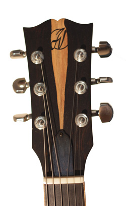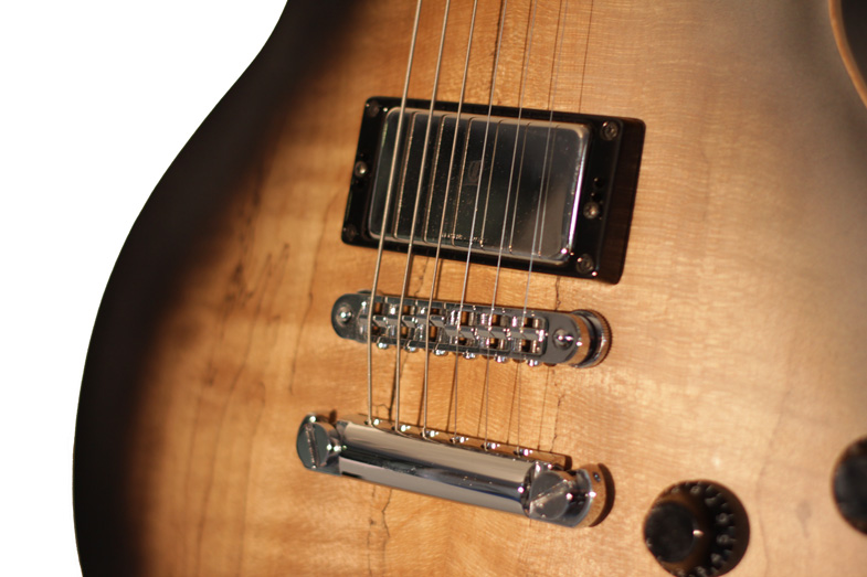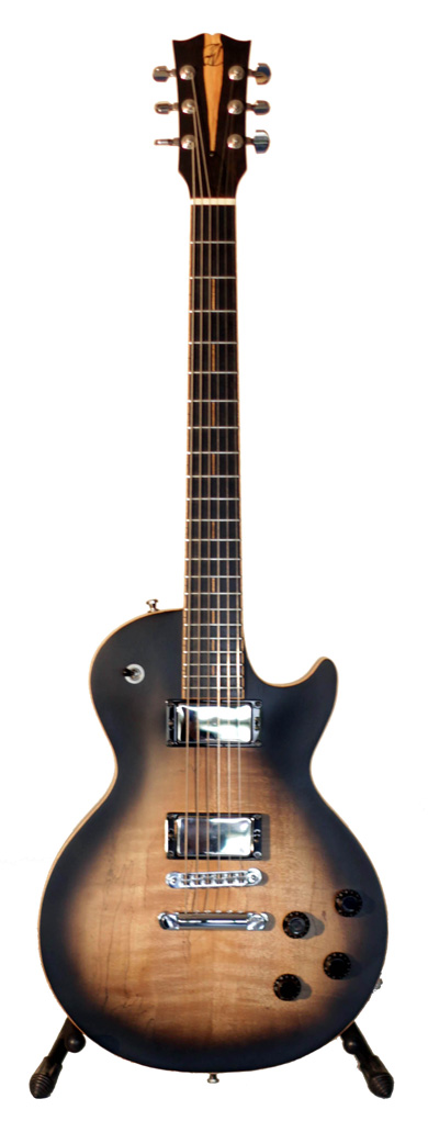 La troisième et dernière guitare du jeune luthier Jérôme Vander Maren est une réplique revisitée de Les Paul avec une finition sunburst et une personnalisation de la tête plaquée d'ébène avec son aubier.