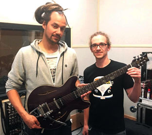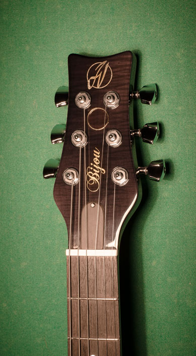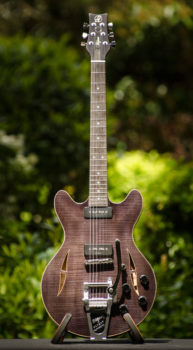 Préparation d’un nouvel album pour 2016, Jérémie voulait un modèle avec un caractère différent de ce qu’il avait (Les Paul et Stratocater) et très personnel, proche d’une ES 335. En résulte la fabrication d’une Hollow Body « Bijou », en érable ondé à poutre centrale équipée de deux P90 Benedetti Pickups et d’un Bigsby offrant des sonorités très brillantes et claires tout en ne négligeant pas les basses qui restent rondes et présentes.
