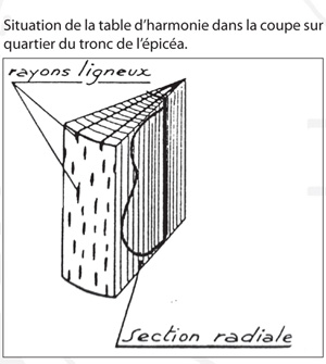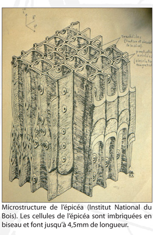 L'épicéa est un résineux dont les fibres sont constituées de cellules axiales très régu- lières (section carrée ou hexagonale) longues de 1,5 à 4,5 mm. Elles sont emboîtées les unes dans les autres par des liaisons en « sifflet ». Ce bois est constitué d'une alternance de fibres tendres, claires (bois de printemps et d'été à croissance rapide), et de fibres dures et sombres (bois d'automne et d'hiver à croissance lente).
