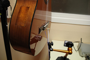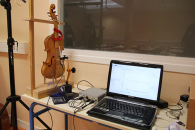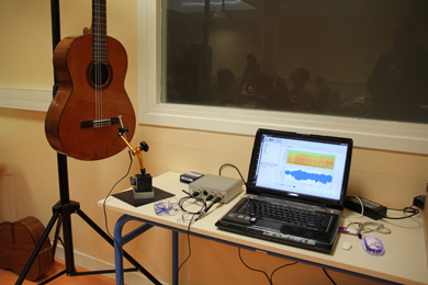 Pour ce faire, un accéléromètre est placé à cet endroit stratégique qu'est le point de connection entre corde et caisse. Ce capteur lorsqu'il est fixé à une structure permet d'en mesurer l'accélération. Un marteau de choc est ensuite actionné et frappe l'instrument afin de provoquer une vibration. Ajoutons que l'instrument est suspendu et les cordes bloquées pour faciliter la lecture de la mesure et s'affranchir des vibrations liées au support (potence, etc) et aux cordes de l'instrument.