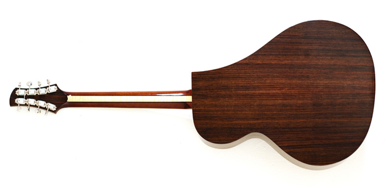 D'abord, avec ses 8 cordes, on découvre une sonorité proche de la 12 cordes, mais le fait que seules les 2 cordes centrales soient doublées permet d'avoir une largeur au sillet de 46mm, et de conserver un confort de jeu proche de la 6 cordes.