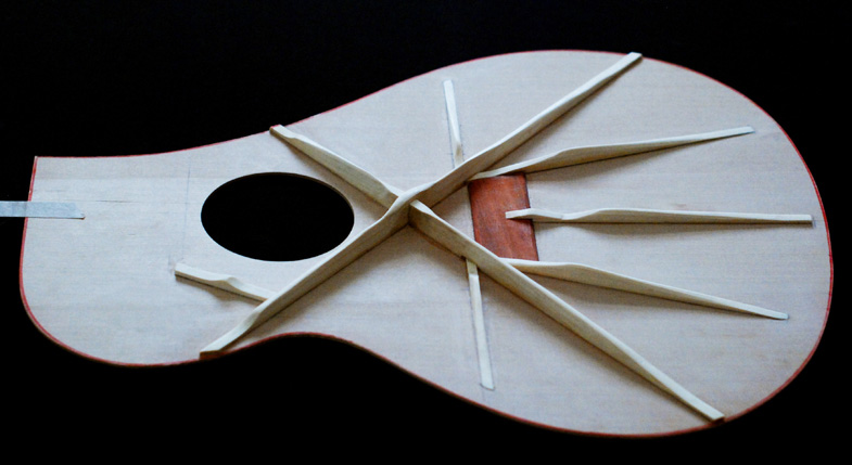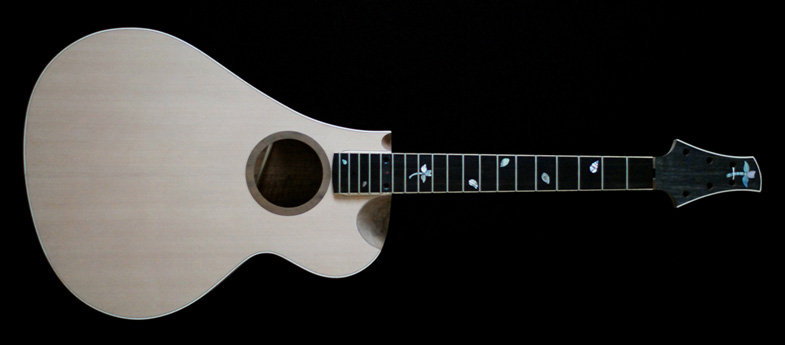 Ce modèle possède un petit volume de caisse, idéal pour le finger-style. (photo du modèle en cours de réalisation) |