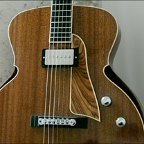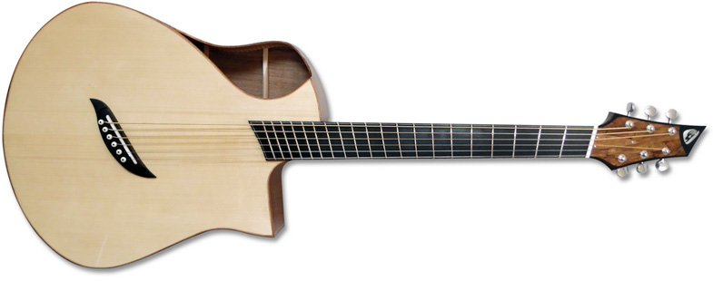 On était déjà habitué aux guitares innovantes de Franck mais avec le modèle Katrina, il est allé plus loin en y appliquant un fan-fret, des courbes bien originales et un évent à la "Audirac" assez surprenant par la taille de son ouverture.