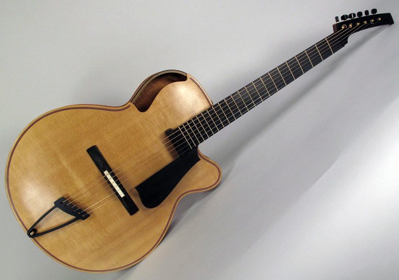 Le luthier Ken Parker accompagné de son ami et associé le luthier Fred Kopo, présentait son tout nouveau bébé : "Semeur", sur les bases de son modèle arch-top acoustique que vous pouvez déjà retrouver dans la boutique des guitares de luthiers de laguitare.com (photo ci-dessous).