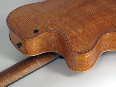 La table voutée est un épicéa d'Alaska, le dos et les éclisses sont en acajou ondé de toute beauté.