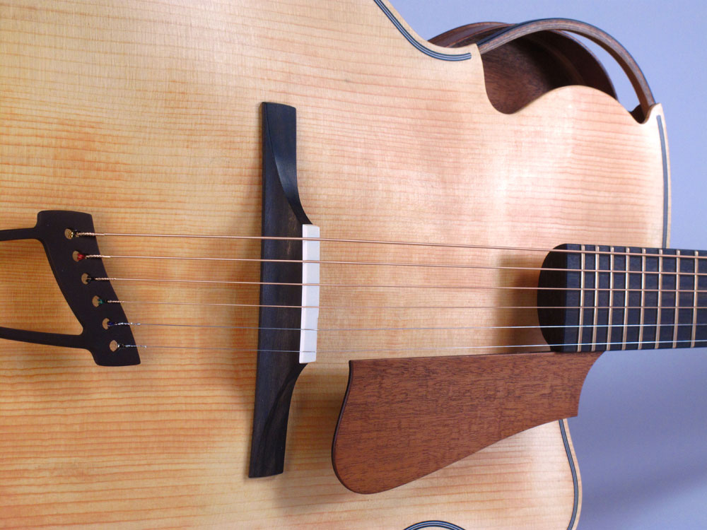 Toutes les essences et tous les matérieux utilisés font l'objet d'une sélection draconienne. Tout est du haut de gamme, même la plus petite pièce. Le cordier est suspendu sur une boule en laiton. Les mécaniques sont réalisés aussi par Ken. D'ailleurs, Ken réalise tout sur cette guitare de A à Z !