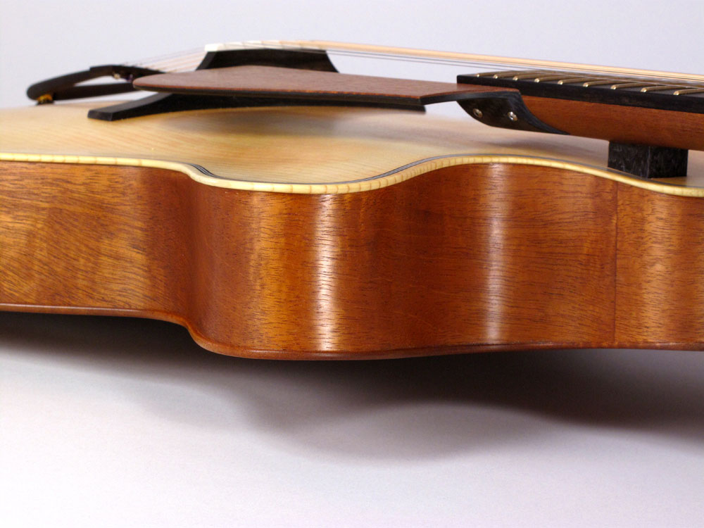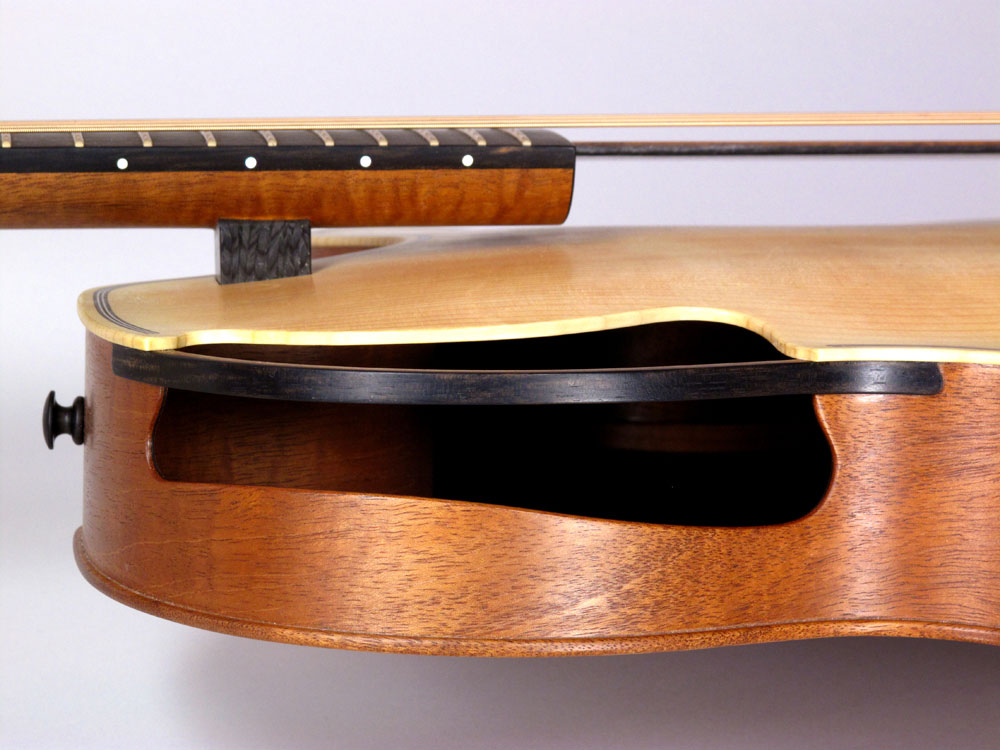 L'ouie sur la partie haute de l'éclisse n'est pas nouveau chez les nord-américains et on voit cette pratique de plus en plus utilisée chez nos luthiers français. Ici Ken a poussé l'esthétisme jusqu'à laisser la contre-éclisse apparente qu'il a renforcé de carbone.