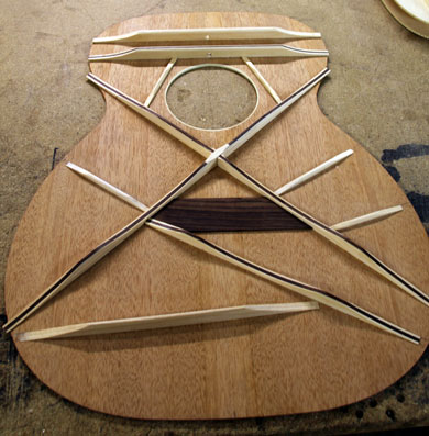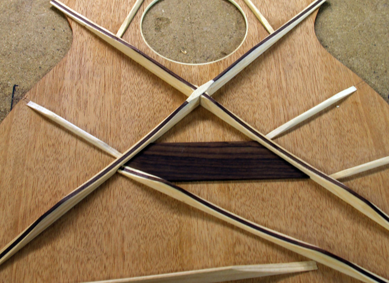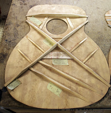 Je vous laisse admirer ci-dessus, le travail réalisé dans l'atelier Dupont sur le barrage de cette table en acajou destinée à une OM. Vous pouvez également apprécier ci-dessous la différence d'emplacement de certaines des barres par rapport à une table d'un modèle OM de chez Martin.