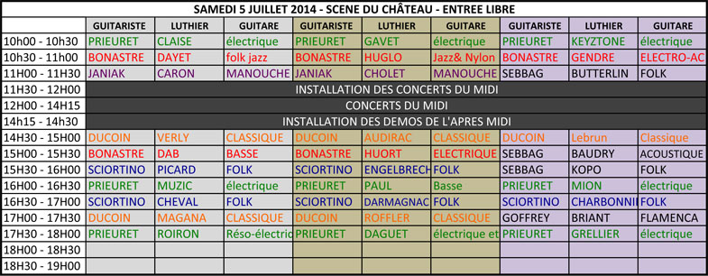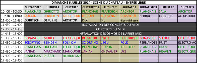 qui se partageront la tâche délicate de vous faire découvrir une guitare par exposant. Certains luthiers viendront accompagnés de leur musicien, c'est le cas de Gérard Defurne avec Tomás Gubitsch, Rico Priet avec Christian Fernandez, etc.